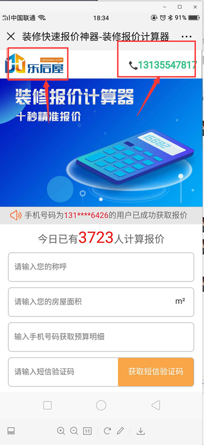 其中,裝修報(bào)價(jià)計(jì)算器是我們核心的引流獲客營(yíng)銷工具之一,為業(yè)主送福利,業(yè)主可以不用考慮計(jì)算方法、步驟,只要填寫(xiě)手機(jī)號(hào)和驗(yàn)證碼就行了,既方便業(yè)主預(yù)算裝修價(jià)格,也給裝飾公司提供獲客的渠道。
